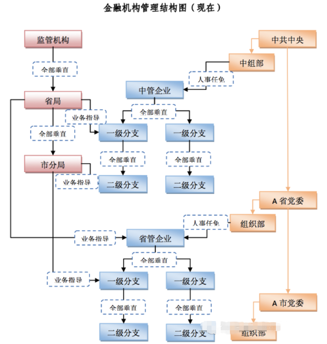 随着 203 年中央完成金融集权,中共中央金融工委撤销,金融体系的党委监管权分别下放到各监管机构,被监管金融机构的党组织关系分别设在央行、银监会、证监会、保监会,由他们“代管党的组织关系”。