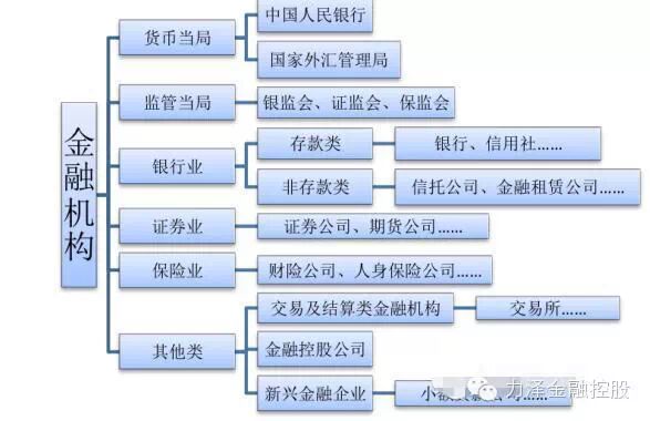 结合这一规范,根据机构监管条线,中国的金融体系的组成包括如下机构:鉴于中国目前机构监管的特征,各金融机构的准入、业务审批等均受限于其监管上级,由具体的司、局、部(委下面的部)进行管理。