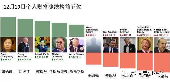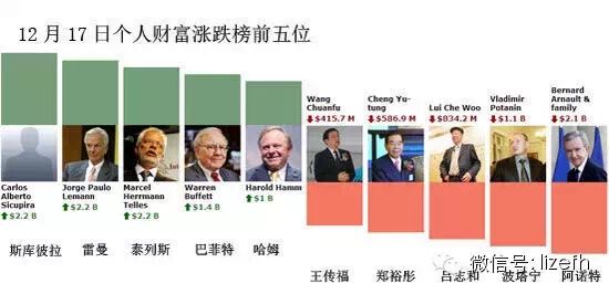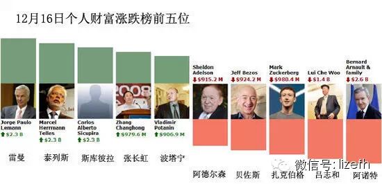 12月16日,私募股权业的“巴西三剑客”豪尔赫·保罗·雷曼、马塞尔·赫尔曼·泰列斯、卡洛斯·阿尔贝托·斯库彼拉排在财富增长榜的前三位,财富增长均为23亿美元。排在第四位的是张长虹,当日财富上涨9.8亿美元。排在第五位的是诺尔里斯克镍矿公司董事长弗拉基米尔·波塔宁,财富增涨9.07亿美元。