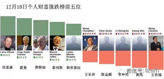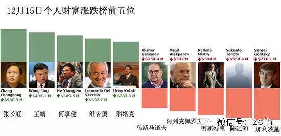 12月15日,上海大智慧董事长张长虹的财富增长排在第一位,当日上涨9.8亿美元。其次是信威集团董事长王靖,当日财富增长4.95亿美元。美的创始人何享健排在第三位,财富增长3.7亿美元。陆逊梯卡集团创始人莱昂纳多·戴尔·维吉奥排在第四位,财富增长3.08亿美元。印度的第一位亿万富豪银行家乌代·科塔克的财富增长2.82亿美元,排在第五位。